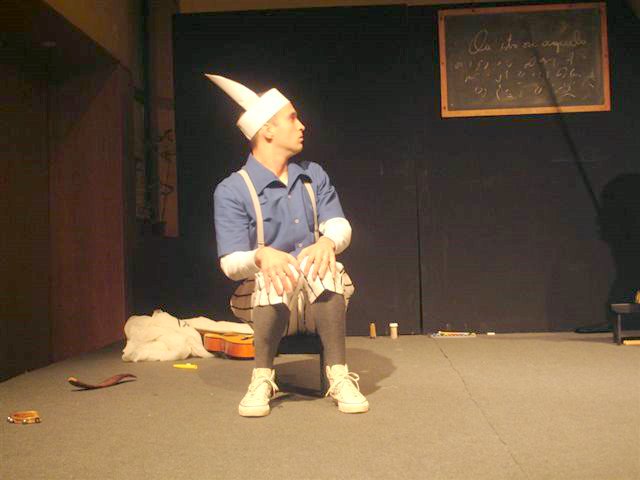 professor e uma cadeira/banco para um dos actores sentado entre os 60